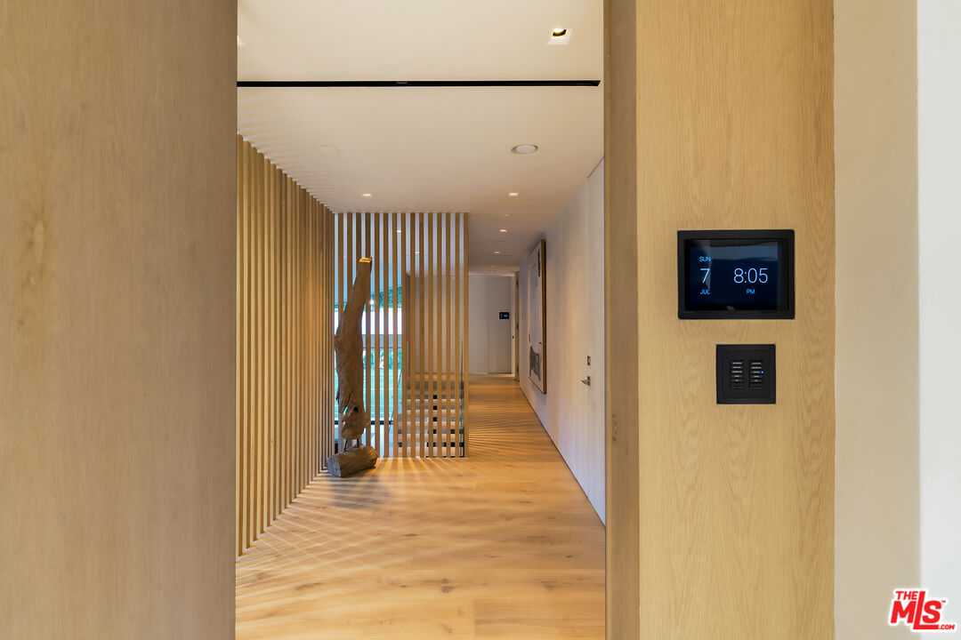 An astonishing architectural paragon is newly complete, designed by Zahra Khajooei and meticulously crafted with the choicest materials while masterfully employing design principles to form a perfect haven of ultimate comfort, recreation, privacy, and luxury with Getty Center views. Certainly one of the most important pieces to come to market in 2024, this smart-home, tennis court residence is set on a private, non-through street and delivers a modern lifestyle of experiential discovery and endless inspiration. An impressive repetition of stone leads to a double-height foyer dressed in travertine as a series of wood panels converge to simultaneously draw the eye upward and forward into the public entertaining spaces. Picture windows and motorized Fleetwood doors reveal bursts of lush greenery and the surrounding natural paradise. The open-concept plan leads from formal living room to dining, each characterized by the adjacent floating staircase, itself a centerpiece on display. A sleek Poliform kitchen is equipped with rich marble countertops and island as well as a butler's pantry and state-of-the-art chef-grade appliances including Gaggenau, Miele, and Sub-Zero. Overlooking these spaces is a thoughtfully designed family room that doubles as a viewing lounge for afternoon tennis matches and includes a billiards/gaming area and wet bar. The primary wing is complete with a stone fireplace, private balcony, and spa-like bathroom with floating dual-sink vanity, makeup desk, pedestal soaking tub, and double-size rainwater/steam shower with ledge, all amidst views of untouched California hilltops in the distance. There are also dual changing wardrobes. Outside, relish the infinity-edge pool and spa with baja shelf, enjoy the outdoor kitchen and dine al-fresco, and converse with friends and family in the conversation pit and lounge areas. A motorized gate partition retracts to reveal the full-size tennis court with sports turf, putting green, basketball hoop, and adjustable net for pickleball, volleyball, or badminton. Other amenities and modern conveniences include Juliet balconies in the secondary bedrooms, motorized blackout shades throughout, dog wash, two laundry rooms, and recessed storm drains. Located in one of the most desirable sections of Brentwood, this home is just moments to the area's fine dining, shopping, hiking trails, freeways, and important cultural landmarks plus all the Westside offers. Also available for lease.