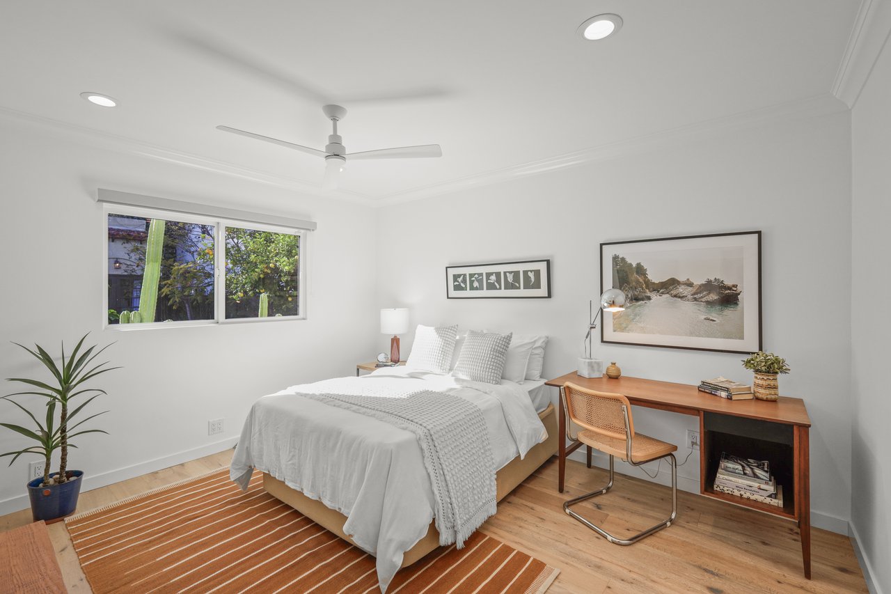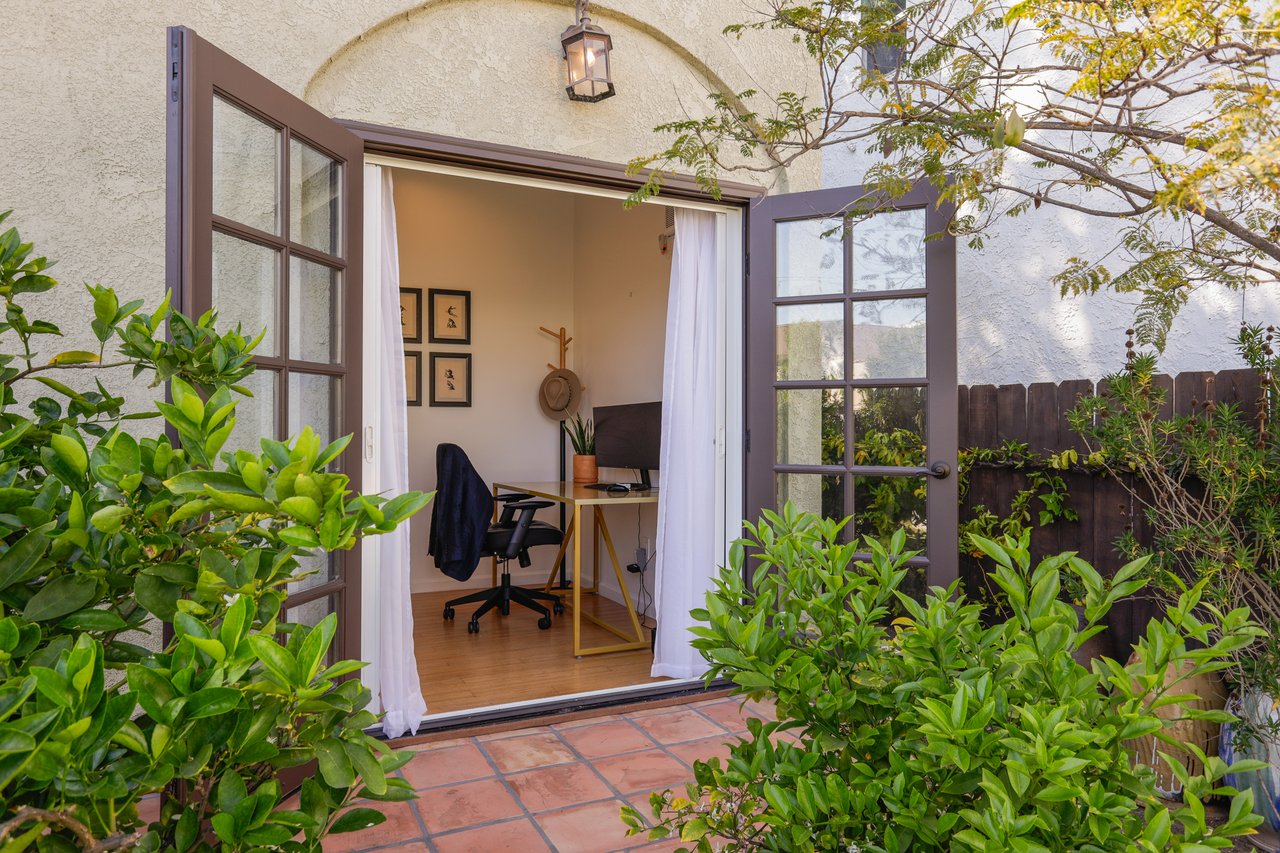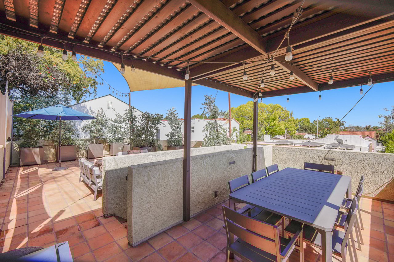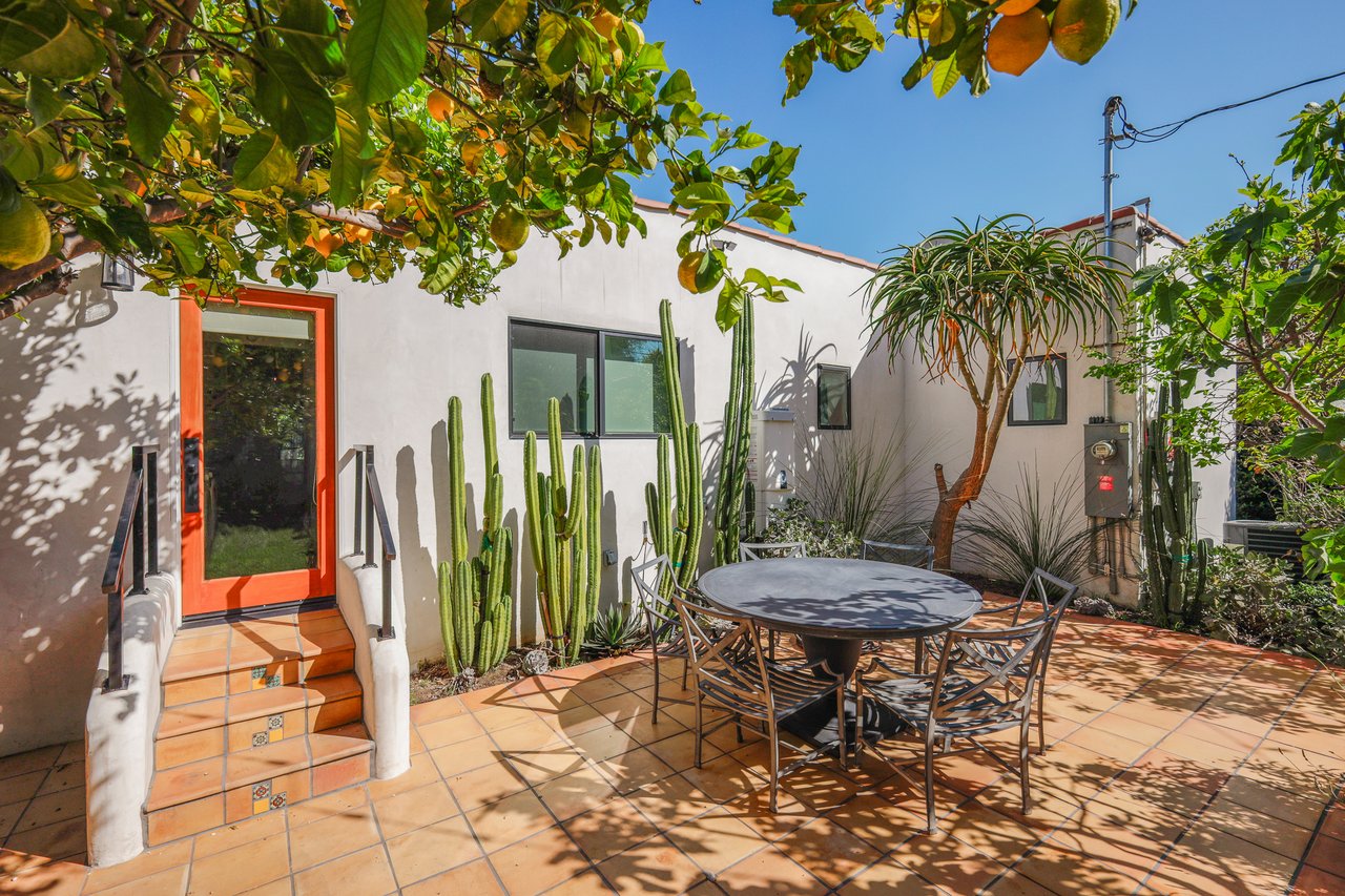 Presenting an incredibly charming Mid-Wilshire Spanish, set back from the street behind mature drought-tolerant landscaping, complete with a guest house with separate entrance. Visitors are greeted by a terra cotta pathway leading to a delightful blue courtyard gate which encloses the front patio. Here, a respite in a green space is provided, unified close to nature while just a stone's throw from the city. Inside, wide-plank floors greet you and flow throughout the open floor plan. The living room includes a large picture window and sloped ceilings typical of this beloved style. Through a curved archway, discover a remodeled kitchen with open shelving, bright white cabinetry, elegant backsplash, and breakfast bar adjacent to the dining room. The primary bedroom features beautiful floral pastels and an en-suite bathroom with dual-sink vanity, clerestory window, and separate shower and tub. The secondary bedroom and bathroom are also updated and light-filled. Relax and dine al-fresco in the enchanting rear patio, located just off the kitchen for convenience and lined with a thoughtful selection of cacti aside a lemon tree. A separate side entry leads to the guest house, perfect for housing family and friends or for generating additional passive income. This second freestanding home includes a living room, a dining area set aside French doors that open to the backyard, and a kitchen with butcher-block prep counter, copious cabinetry, and stainless-steel appliances. An updated bathroom includes a shower, a bedroom serves as the perfect retreat, and an office allows for work, study, or play against a serene backdrop. On the rooftop, enjoy evening dinner parties beneath the pergola or gather for conversation under California skies. The rear grounds also include plenty of grass to roam and an organic vegetable garden. To please the most discerning chef, there are also herbs and eleven fruit-producing trees (lemon, lime, yuzu, fig, Japanese tangerine, persimmon, apple, orange, kefir lime, and pomegranate). Upgrades include, but are not limited to, canned lighting, upgraded electrical, new windows, new hvac system, new hardscaping, tankless water heater, and washer/dryer combo in both the main home and guest house. With close proximity to Museum Row's many world-famous museums, including LACMA, the La Brea Tar Pits, and the newer Academy Museum of Motion Pictures, life here is always rich in cultural influence, creative expression, and historical significance. As part of its efforts to extend the D Line (purple), Metro will soon open the nearby Wilshire/La Brea Station, expected to be completed later this year, which connects Mid-Wilshire to downtown and the rest of the city, ultimately leading through Beverly Hills to Westwood/UCLA. This ideal central location is also mere moments to medical centers, The Grove, Larchmont Village, West Adams, Culver City, Century City, and more. Due to the planning of this close-knit neighborhood, residents here enjoy less traffic in a non-through section of Sycamore Avenue. Welcome home!